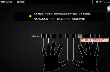 2、单击已登记过指纹的手指按钮,选择删除现有的指纹