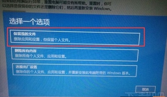 Win10系统重置过程中会有三种重置模式选择,即“保留我的文件”、“删除所有内容”、“还原出厂设置”