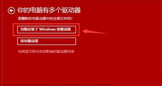 若选择“仅限安装了Windows的驱动器”,重置过程将仅对系统盘执行重置动作