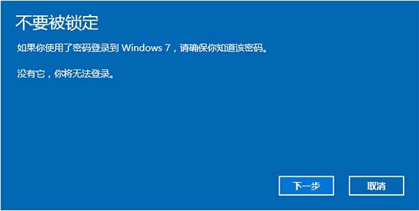 7、 对于已经设定登录密码的用户,回退后密码将被恢复,因此你需要知道该密码才能正常登录。确认该消息不会影响到你的使用后,点击“下一步”继续;